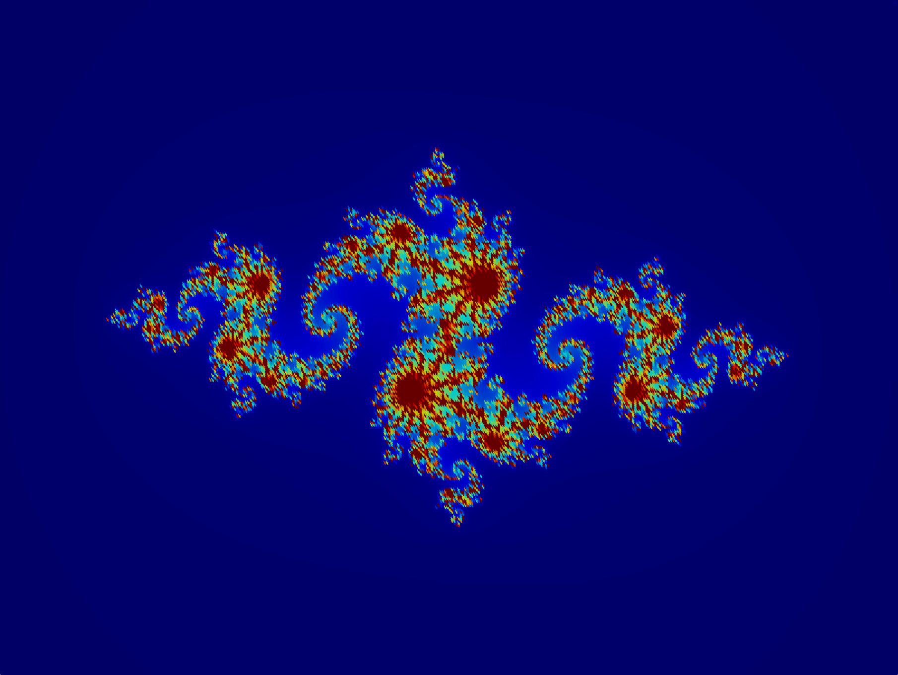 % options: \MagnetFractal[xmin=-2,xmax=2,ymin=-2,ymax=2,dx=0.02,dy=0.02,max_iter=100,cmap=jet]
